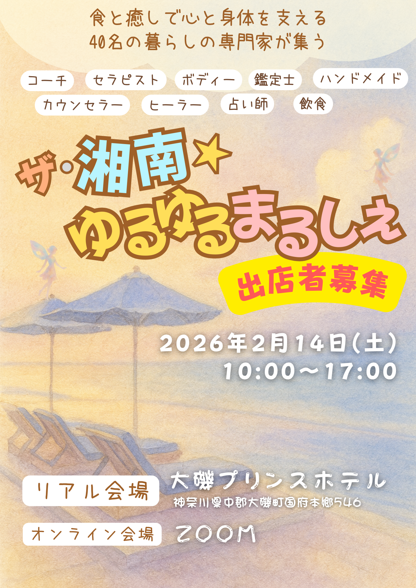 2026/2/14(土)、神奈川県の大磯プリンスホテルに、コーチ、カウンセラー、セラピスト、ヒーラー、占い師、鑑定士、ハンドメイド、飲食が集まる癒やしイベントです。あなたの魅力を最大限に伝え、お客様とつながる大チャンスです!
