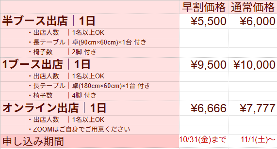 1名で小さいブースを希望の方は、コチラの半ブースをお選びください。残り半分のブースの出店者は指定できません。